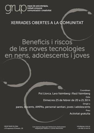Us informem d’una xerrada oberta i gratuïta prevista pel proper dimecres 25 de Febrer de 20:00 a 21:30 hores que es durà a terme a GRUP, entorn de la temàtica de les noves tecnologies en nens adolescents i joves. Després d’una presentació breu, es realitzarà un debat sobre aquests temes d’actualitat i rellevància en l’educació i la salut mental.