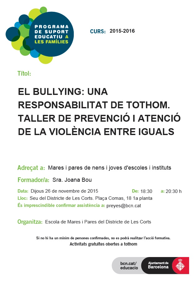 En el marc de l’Escola de Mares i Pares del Districte Hi ha previst una xerrada sobre “El bullying: una responsabilitat de tothom. Taller de prevenció i atenció de la violència entre iguals”. Serà el proper dijous 26 de novembre a les 18:30 h.