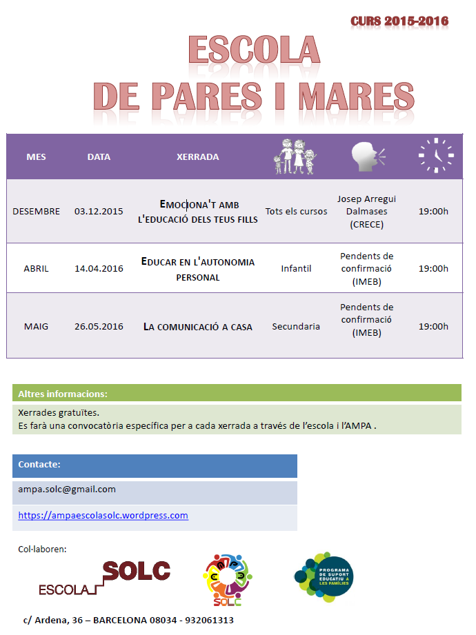 Desitjant que sigui del vostre interès, us esperem el proper dijous 3 de desembre a les 19h a l’escola Solc.