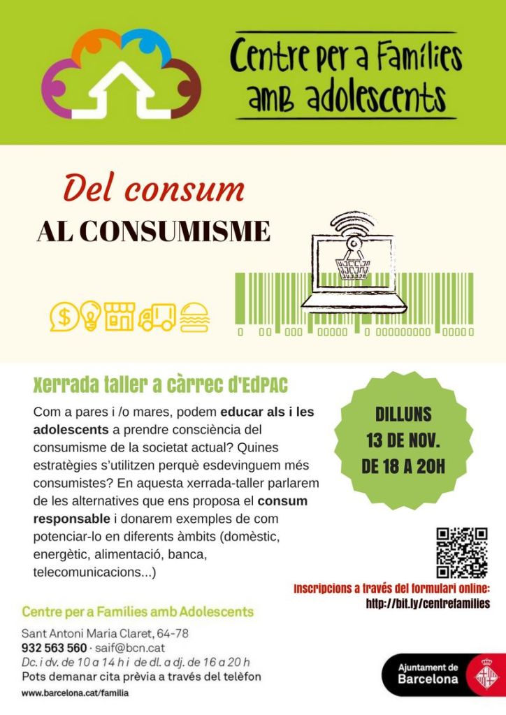 Us informem sobre la xerrada taller: “Del consum al consumisme” a càrrec d’EdPAC, que tindrà lloc el proper dilluns 13 de novembre, a les 6 de la tarda. Una activitat on parlarem de les alternatives que ens proposa el consum responsable i donarem exemples de com potenciar-lo en diferents àmbits.