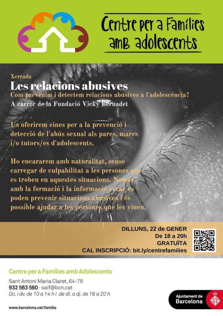 També us informem que encara queden places per la xerrada que tindrà lloc el dilluns 22 de gener “Les relacions abusives. Com les prevenim i detectem a l’adolescència” a càrrec de la Fundació Vicky Bernadet. Oferiran eines per a que com a pares, mares i/o tutors d’adolescents, puguem prevenir i detectar l’abús sexual en aquesta etapa.