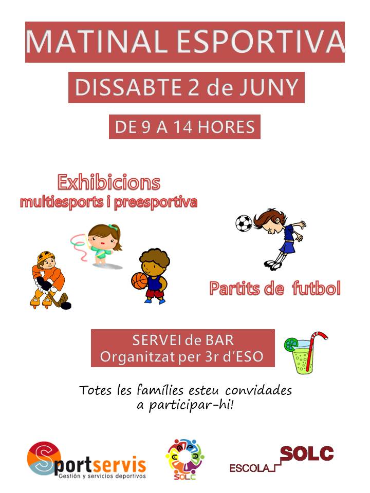 Us esperem el proper dissabte dia 2 a l’Escola per a gaudir de la tradicional “Matinal Esportiva” on tindran lloc exhibicions de l’activitat de multiesport i escola preesportiva, així com diferents partits de futbol! Tot això, amenitzat pel servei de bar que organitzen els alumnes de 3r d’ESO. Us hi esperem!!!