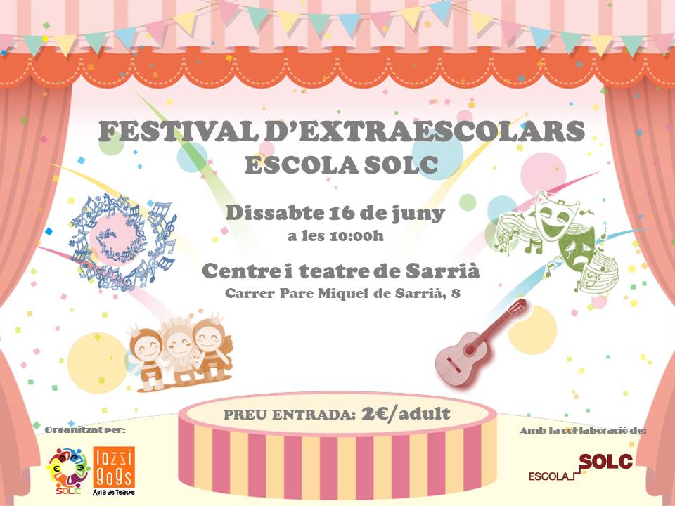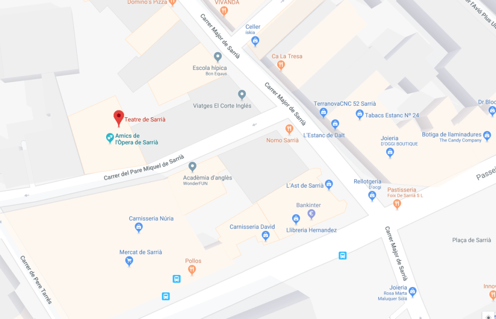 Recordar-vos que aquest any hem canviat el teatre. Adjuntem adreça: Teatre de Sarrià (Carrer del Pare Miquel de Sarrià, 8 08034 Barcelona). S’hi pot arribar en cotxe, o en transport públic (Autobusos línies 68,75, H4 o FCG Reina Elisenda o Sarrià).