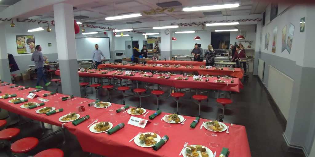 Dins el menjador l’ambient era ben diferent…. Taules amb mantell vermell, tovallons verds i uns tovalloners que els alumnes de l’espai foc junt amb la col·laboració de l’Ari ens havien preparat. Tots uns artistes!!!