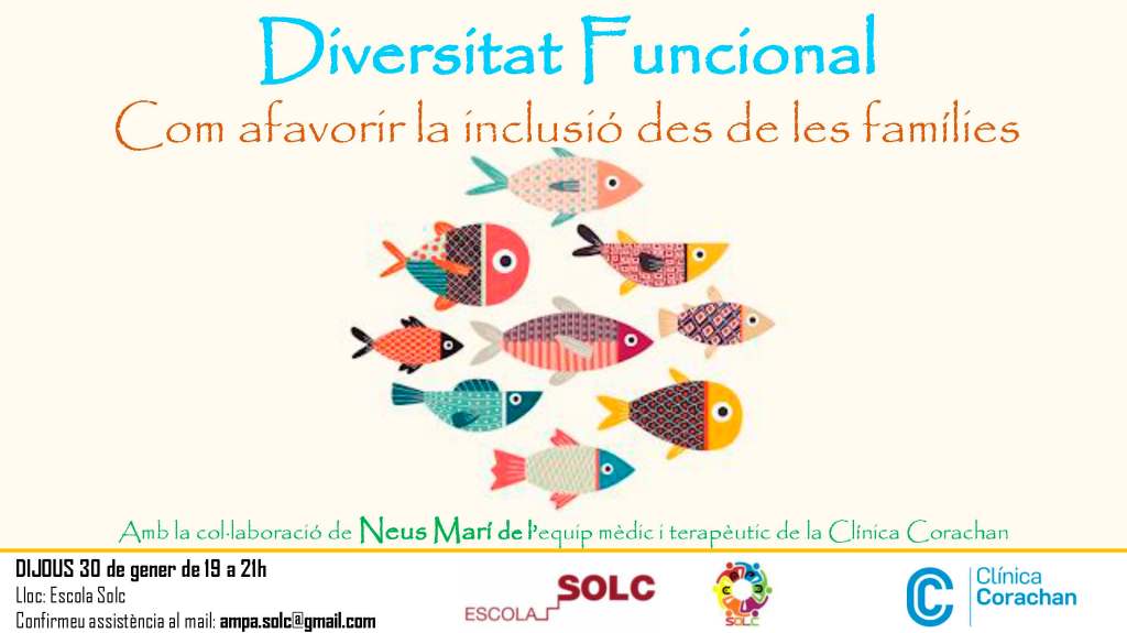 Us convidem el proper dijous 30 de gener a les 19:00h a l’Escola Solc a la xerrada sobre la Diversitat funcional a càrrec de Neus Marí Cardona, especialista en atenció terapèutica i educativa de la Clínica Corachan