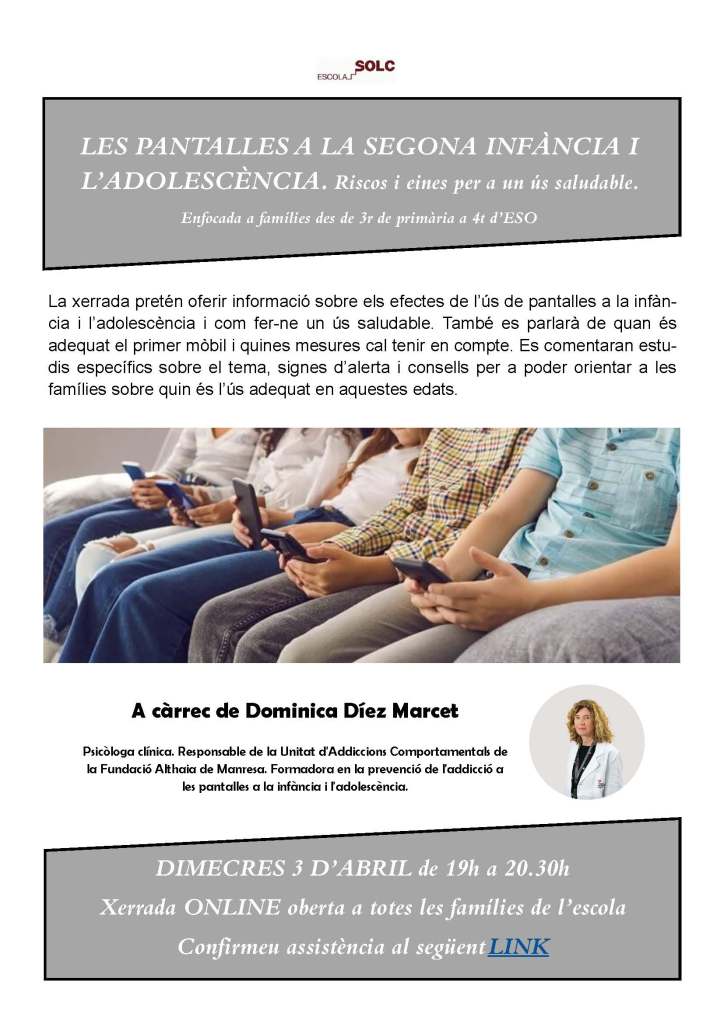 A càrrec de Dominica Díez Marcet, psicòloga clínica. Responsable de la Unitat d’Addiccions Comportamentals de la Fundació Althaia de Manresa. Formadora en la prevenció de l’addicció a les pantalles a la infància i l’adolescència