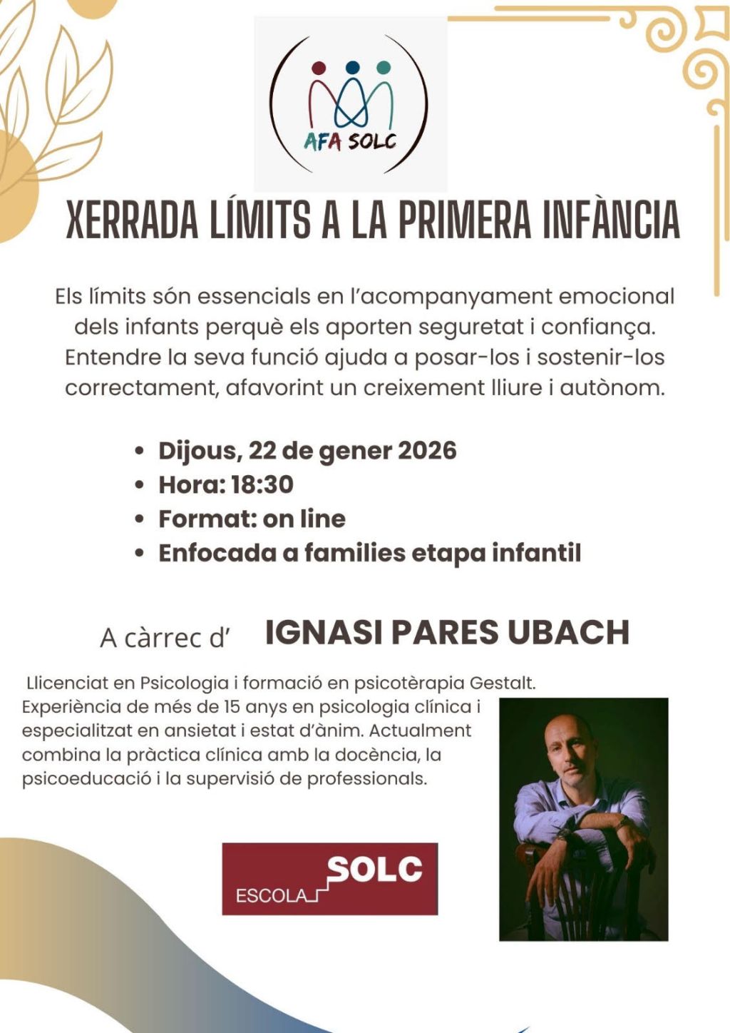 Famílies! Pròxima xerrada online sobre límits a la primera infància, a càrrec d’Ignasi Parés Ubach, llicenciat en Psicologia i format en psicoteràpia Gestalt.